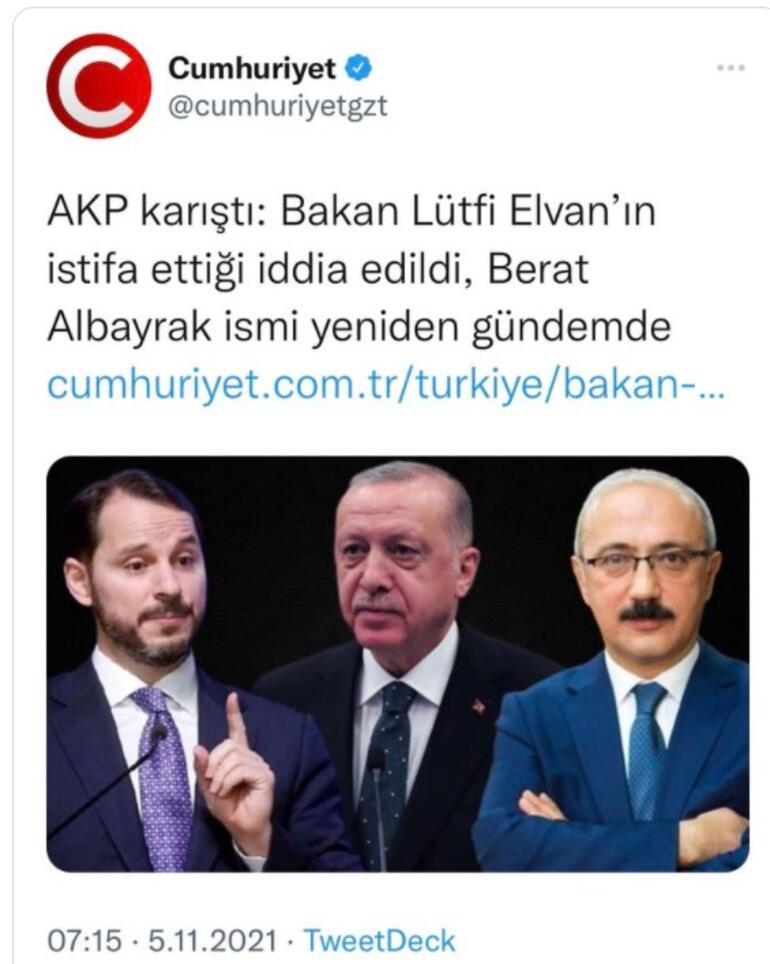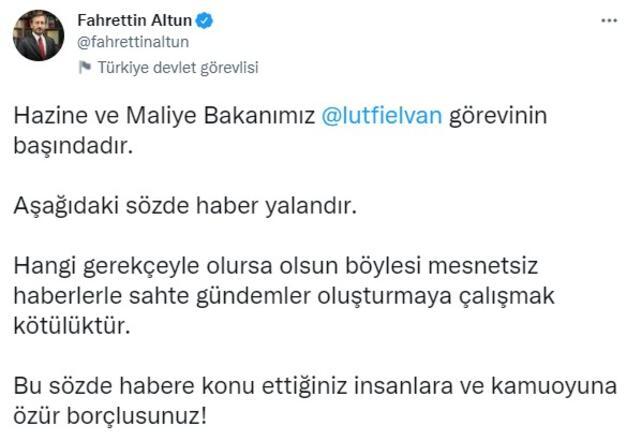 "Hazine ve Maliye Bakanımız Lütfi Elvan görevinin başındadır. Aşağıdaki sözde haber yalandır. Hangi gerekçeyle olursa olsun böylesi mesnetsiz haberlerle sahte gündemler oluşturmaya çalışmak kötülüktür. Bu sözde habere konu ettiğiniz insanlara ve kamuoyuna özür borçlusunuz!"