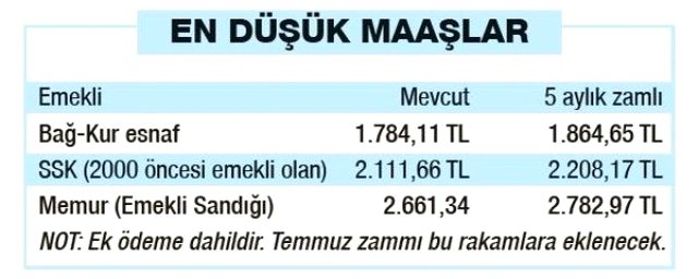 Haziran enflasyonuna göre zam oranı artacak ya da azalacak. Kesin oran 3 Temmuz'da belli olacak. Ancak 4, 57'lik artışa göre; SSK ve Bağ- Kur emeklilerinin gelirinde 275, 51 liraya varan artış yaşanacak. En yüksek aylık net maaş 6 bin 28 lira 72 kuruştan 6 bin 304 lira 23 kuruşa çıkacak.