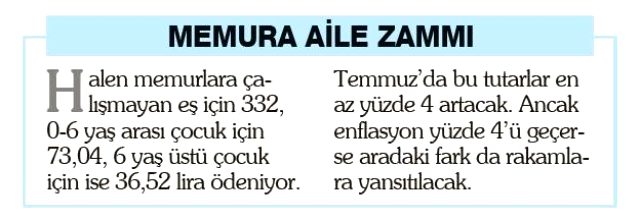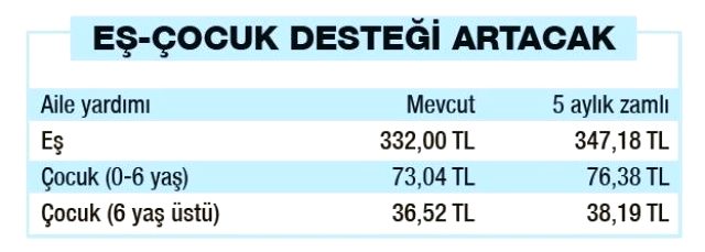 Talepler hayata geçerse; çalışırken ödenen aile yardımı emeklilikte de sürecek. Memurlara eş için 332, 0-6 yaş arası çocuk için 73, 04, 6 yaş üstü çocuk için 36, 52 lira olarak uygulanan aile yardımından, emekliler de yararlanacak. Eşi çalışmayan, 6 yaş üstü 2 çocuğu olan emekli, aylık 405 lira alacak.