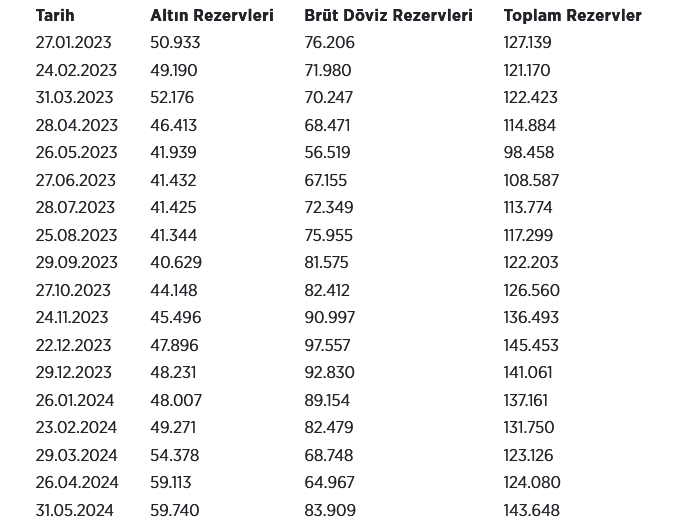 Brüt döviz rezervleri, 2 Ağustosta 92 milyar 491 milyon dolar seviyesinde bulunuyordu.Bu dönemde altın rezervleri ise 8 milyon dolar artışla 57 milyar 895 milyon dolardan, 57 milyar 903 milyon dolara çıktı.
