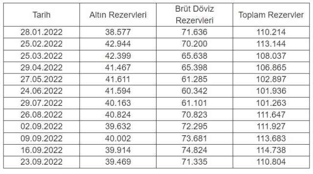 Böylece Merkez Bankası'nın toplam rezervleri, 23 Eylül haftasında bir önceki haftaya kıyasla 3 milyar 934 milyon dolar azalışla 114 milyar 738 milyon dolardan 110 milyar 804 milyon dolara indi.