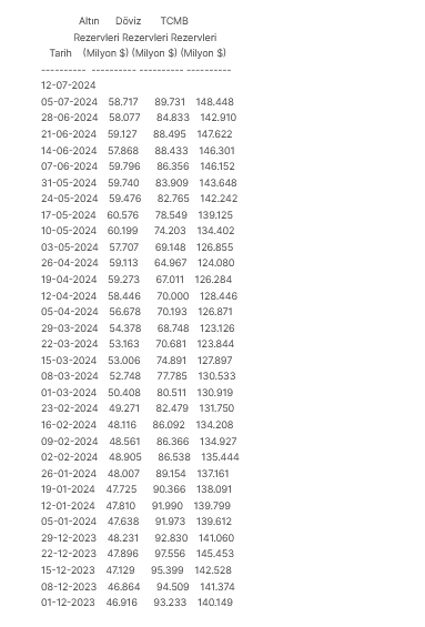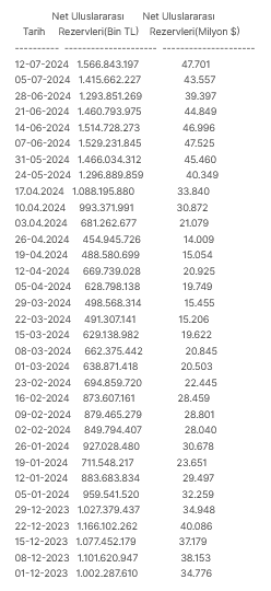 TCMB verilerine göre, 12 Temmuz itibarıyla toplam rezervler 5 milyar 348 milyon dolar artarak 148 milyar 448 milyon dolardan, 153 milyar 796 milyon dolara çıktı. Brüt rezervler 89 milyar 731 milyon dolardan 94 milyar 345 milyon dolara yükseldi.