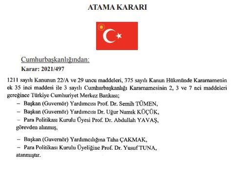 Buna göre, TCMB başkan yardımcıları Tümen ve Küçük ile Para Politikası Kurulu Üyesi Yavaş, 1211 sayılı Kanunun 22/A ve 29'uncu maddeleri, 375 sayılı Kanun Hükmünde Kararnamenin ek 35'inci maddesi ile 3 sayılı Cumhurbaşkanlığı Kararnamesi'nin 2, 3 ve 7'nci maddeleri kapsamında görevden alındı.