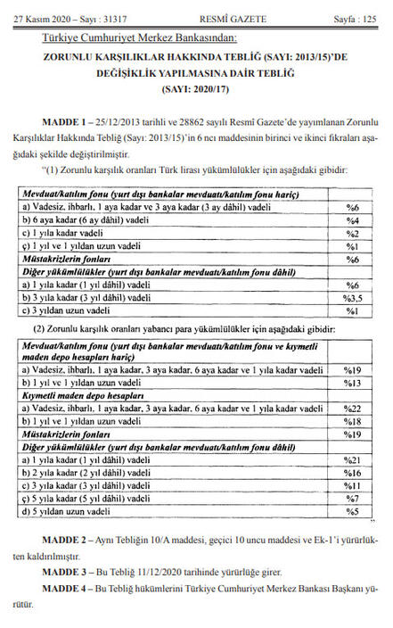 - Yabancı para zorunlu karşılık oranı, vadesiz, 1 yıla kadar vadeli hesaplarda yüzde 17'den yüzde 19'a çıkarıldı.