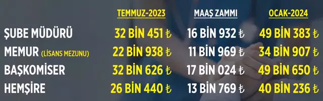 Daha yüksek maaş alan memurlar da yüzde 52, 18 oranı üzerinden zam alacak. Örneğin 32 bin 451 lira maaş alan bir şube müdürünün maaşı ocak ayında 49 bin 383 liraya, üniversite mezunu memurun maaşı 34 bin 907 liraya, başkomiserin maaşı 49 bin 650 liraya yükselecek. Şu an 26 bin lira maaş alan hemşirelerin maaşı ise ocak ayında 40 bin liranın üzerine çıkacak.