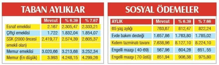 - Tablolarda emeklilerin ve memurların aldığı en düşük maaşlar ve sosyal yardım ödemeleri bulunuyor. Emekli ve sosyal yardım maaşlarını 5 aylık enflasyon olan yüzde 6.39'a göre hesapladık.