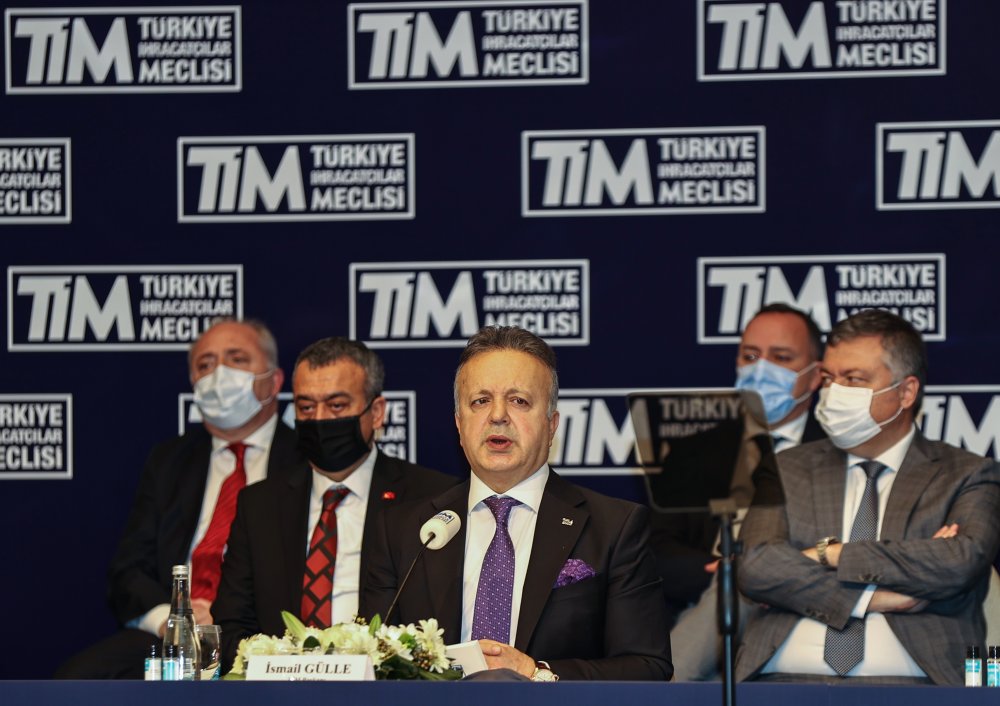 (Türkiye İhracatçılar Meclisi (TİM) Başkanı İsmail Gülle (ortada), İhracat 2021 Raporu'nun tanıtım toplantısına katılarak konuşma yaptı.)