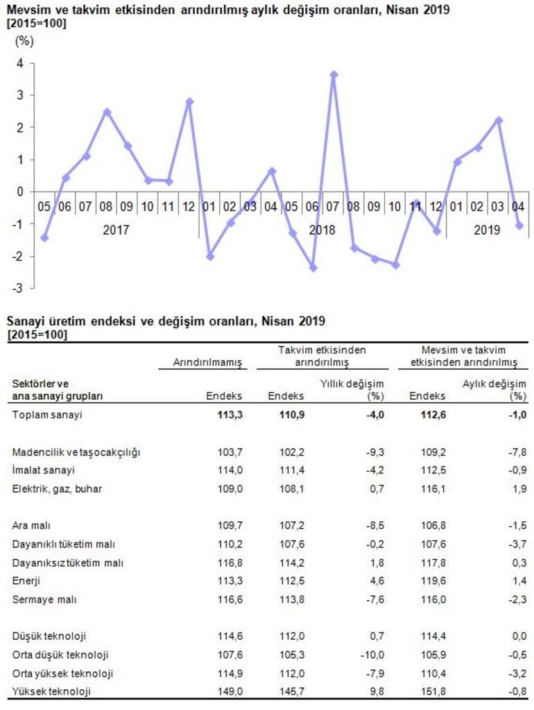 Sanayinin alt sektörleri (2015=100 referans yıllı) incelendiğinde, 2019 yılı Nisan ayında madencilik ve taşocakçılığı sektörü endeksi bir önceki aya göre %7, 8 ve imalat sanayi sektörü endeksi %0, 9 azalırken elektrik, gaz, buhar ve iklimlendirme üretimi ve dağıtımı sektörü endeksi %1, 9 arttı.