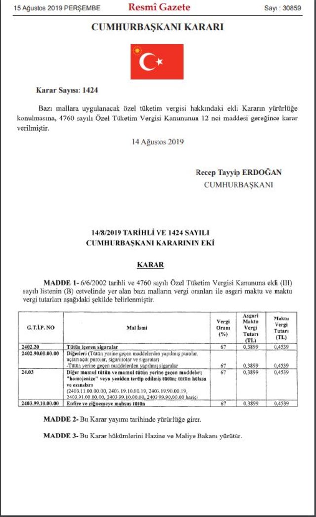 Sigarada asgari maktu vergi 4 Temmuz'da 0.2679 liradan 0.2895 liraya yükseltilmişti. Sigaranın vergi oranı yüzde 67, maktu vergi tutarı ise 0.4539 lira olarak korundu.