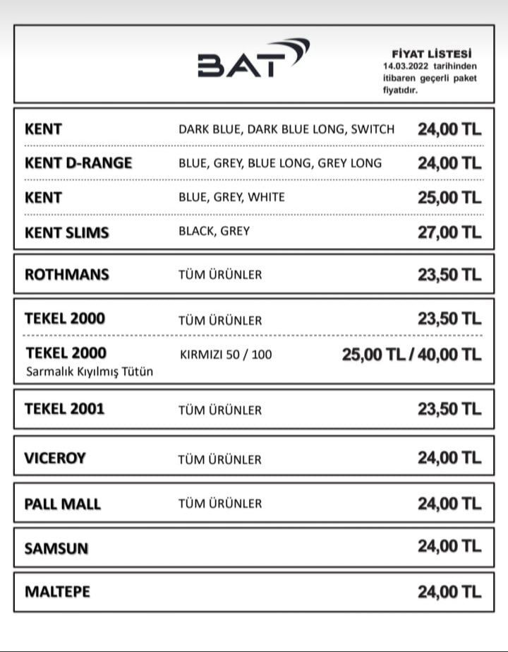 - Tekel 2000 (Tüm Ürünler): 23 lira 50 kuruş