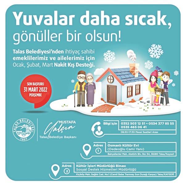 Talas Belediye Başkanı Mustafa Yalçın, şu bilgileri verdi: “Belediye olarak ‘Yuvalar daha sıcak, Gönüller bir olsun’ anlayışıyla hareket ediyoruz.