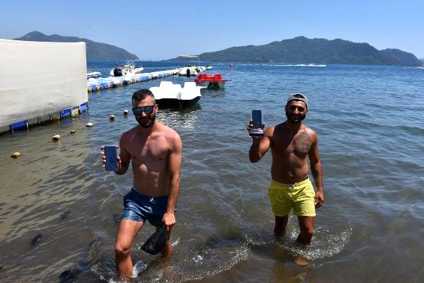 Marmaris'te tatil yapan ve su geçirmez kılıfıyla denizde fotoğraf çekmenin keyfini yaşayan veteriner Azad Kolgezen (27), "Su geçirmez kılıfı takıyorum, denizde video ve fotoğraf çekiyorum. Görüşmeleri bununla yapıyorum. Hayatın her anını çekmek için teknolojiden yararlanıyorum" dedi.