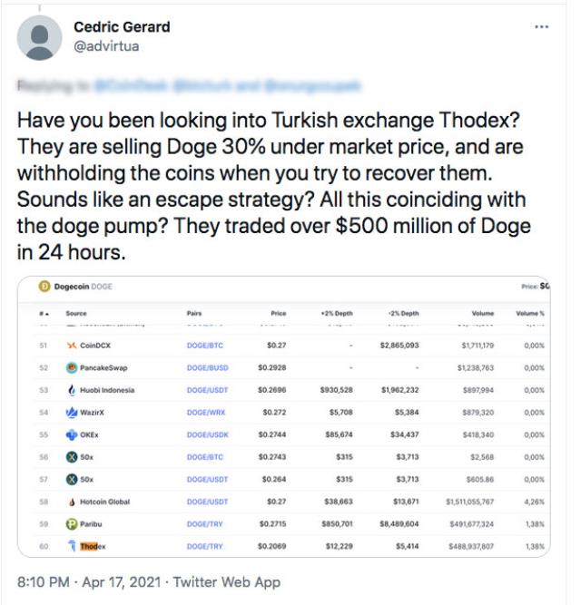 Sosyal medya ağı Twitter'da Cedric Gerard adlı bir kullanıcı, Thodex'in geçtiğimiz günlerde piyasa fiyatının yüzde 30 altına Dogecoin sattığını ve kripto paralarını almak isteyenlere izin vermediğini belirtti. Gerard, Thodex'in 24 saat içinde yaklaşık 500 milyon dolarlık Dogecoin sattığını yazdı ve düşük işlem fiyatını gösteren ekran görüntüsü paylaştı.