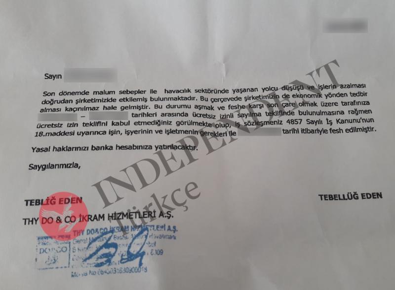 Turkish DO&CO, işine son verdiği çalışanlarına gönderdiği tebligatta şu ifadeleri kullandı: