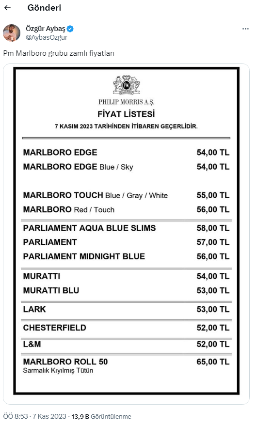 Türkiye Tekel Bayiler Platformu Başkanı Özgür Aybaş, Philip Morris grubundaki sigaralara zam geldiğini duyurdu.