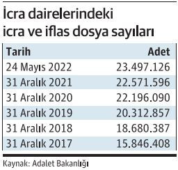2020 yılı Mart ayında yayımlanan Cumhurbaşkanı Kararı ile COVID-19 salgın hastalığının yayılmasını önlemek amacıyla alınan tedbirler kapsamında nafaka alacaklarına yönelik olanlar dışında tüm icra ifl as takipleri durdurulmuştu. Daha sonra bir süre daha uzatılan yasaklar, normalleşme süreciyle birlikte kaldırılmıştı. İcra yasağının kaldırılmasıyla birlikte mahkemelerdeki icra dosyası sayısı da yeniden tırmanışa geçti. 2021 sonunda 22 milyon 571 bine çıkan icra dosyası sayısı 24 Mayıs 2022 itibarıyla, yani yılbaşından bugüne yaklaşık 1 milyon artarak 23 milyon 497 bin 126’ya ulaştı.