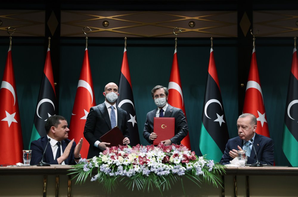 (Cumhurbaşkanı Recep Tayyip Erdoğan ve Libya Milli Birlik Hükümeti Başbakanı Abdülhamid Dibeybe'nin Cumhurbaşkanlığı Külliyesi'nde baş başa ve heyetler arası görüşmelerinin ardından, çeşitli anlaşmaların imza törenine geçildi. Erdoğan ve Dibeybe'nin huzurunda, iki ülke arasında 5 anlaşma imzalandı. Törende ayrıca, Cumhurbaşkanı Erdoğan ile Başbakan Abdülhamid Dibeybe, iki ülke arasındaki "Yüksek Düzeyli Stratejik İşbirliği Konseyi Birinci Toplantısı Ortak Bildirisini" imzaladı.)