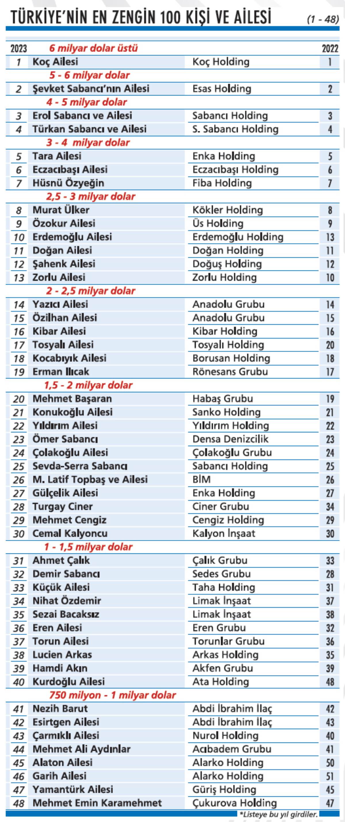 Türkiye'nin zenginler kulübü belli oldu. 2023 yılının sonlarına yaklaşılırken Türkiye'deki en zengin 100 kişi ve aileler belli oldu. Listenin ilk sıralarında Koç ailesi ve Sabancı aileleri yer aldı.