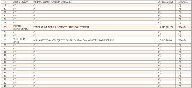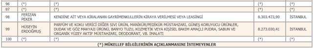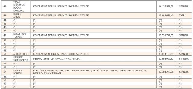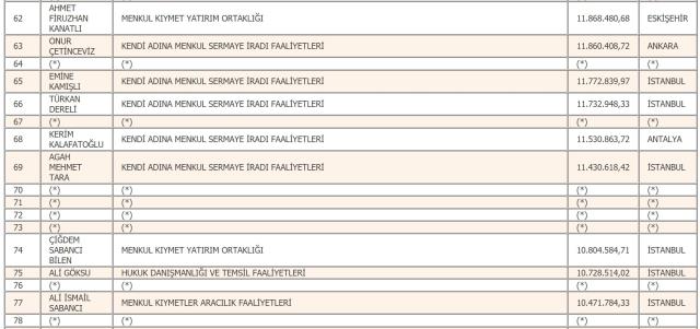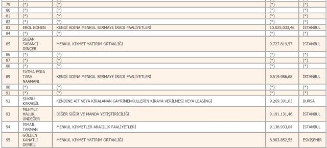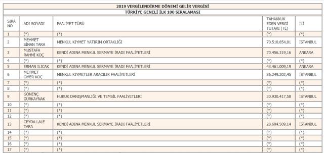 En fazla gelir vergisi beyan eden mükellef listesinin ilk sırasındaki rekortmen, isminin açıklanmasını istemedi. Listenin ikinci sırası ise tahakkuk eden 70 milyon 510 bin 854 liralık vergiyle Mehmet Sinan Tara'nın oldu. Listenin 3'üncü sırasında 70 milyon 456 bin 319 liralık vergiyle Mustafa Rahmi Koç yer aldı.