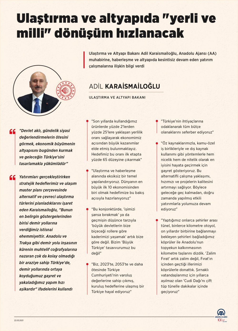 "Gelişmemiş ülkelerde ise altyapıya yönelik büyük hamleler gerçekleştirecek sosyal, ekonomik ve teknolojik olanaklar bulunmamaktadır. Türkiye ise gelişmemiş ülkeler örneklemini çoktan gerilerde bırakmış, gelişmekte olan ülkeler arasından gelişmişliğe doğru sağlam adımlar atmış bir konumdadır. Özellikle dünyanın ekonomik açıdan güçlenen, üretim ve ticarette söz sahibi olan Avrupa, Asya ve Afrika üçgeninin kalbinde olduğumuzu düşünerek benzersiz fırsatlarla da karşı karşıya olduğumuzu görmemiz gerekmektedir. Bu fırsatlara en güçlü şekilde hazırlanmak, çevre ülkelerin ulaşım ihtiyaçlarına da yanıt vermek ve ekonomimizi 'lojistik' gücümüzden gelen kazançlarla desteklemek için ulaştırma ve haberleşme alanında eksiksiz bir temel yapılandırıyoruz. Dünyanın en büyük ilk 10 ekonomisinden biri olmak hedefimize bu bakış açısıyla hazırlanıyoruz. Ulaştırma ve haberleşmeye yatırım, çocuklarımızın geleceğine yatırımdır. Bu konjonktürde, 'işimizi şansa bırakmak' ya da geçmişin düşünce tarzıyla 'büyük devletlerin bize biçeceği rollere göre kaderimizi yaşamak' artık bize göre değil. Bizim 'Büyük Türkiye' tasavvurumuz bu değil. Biz, 2023’te, 2053’te ve daha ötesinde Türkiye Cumhuriyeti'nin varoluş değerlerine sahip çıkmış, kuruluş hedeflerine ulaşmış bir Türkiye hayal ediyoruz."