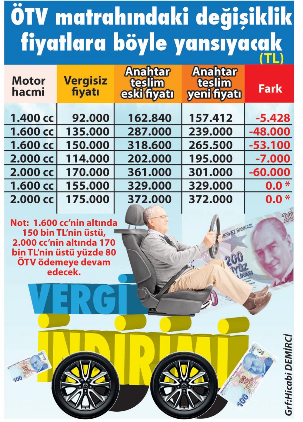SÖZCÜ'den Erdoğan Süzer'in haberine göre, Cumhurbaşkanı kararıyla 2.000 cc ve altındaki otomobillerin ÖTV'ye esas matrahları yüzde 8 ile yüzde 34 oranlarında arttırıldı. Matrahın yükselmesiyle birlikte otomobillerin üzerindeki vergi yükü de 60 bin liraya varan tutarlarda azalmış oldu.