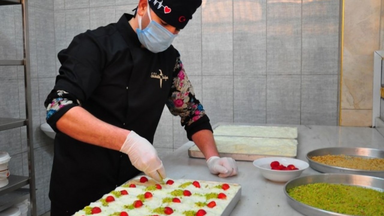 Ustalar, sütlü şerbetle yufkaların ıslatılması, aralarına ceviz konularak, kat kat dizilmesi ve soğuk ortamda bekletilmesiyle yapılan, üzeri ağırlıklı olarak çekilmiş Antep fıstığı ve kokteyl kirazı ile süslenen tatlı talebine yetişmekte güçlük çekiyor.