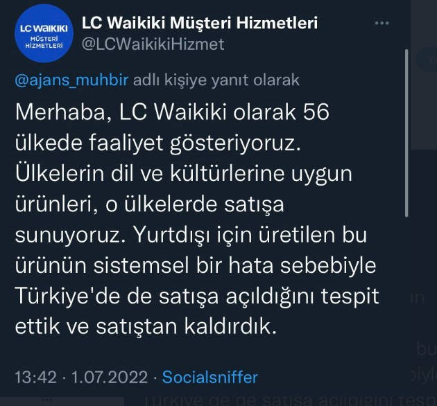 "Merhaba, LC Waikiki olarak 56 ülkede faaliyet gösteriyoruz. Ülkelerin dil ve kültürlerine uygun ürünleri, o ülkelerde satışa sunuyoruz. Yurtdışı için üretilen bu ürünün sistemsel bir hata sebebiyle Türkiye'de de satışa açıldığını tespit ettik ve satıştan kaldırdık."