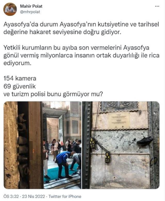 İBB Genel Sekreter Yardımcısı Mahir Polat, yaptığı paylaşımda yetkililere seslenerek "Ayasofya'da durum Ayasofya'nın kutsiyetine ve tarihsel değerine hakaret seviyesine doğru gidiyor. Yetkili kurumların bu ayıba son vermelerini Ayasofya gönül vermiş milyonlarca insanın ortak duyarlılığı ile rica ediyorum." açıklamasını yaptı. Polat, açıklamasının devamında ise yetkililere "154 kamera, 69 güvenlik, ve turizm polisi bunu görmüyor mu?" sorularını yöneltti.