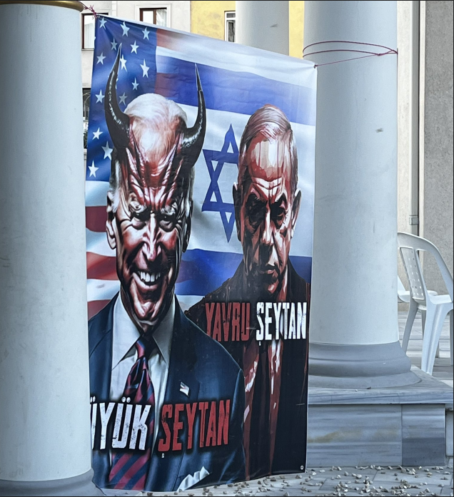 Gazze'de katliam yapan İsrail Başbakanı Binyamin Netanyahu ve destekçilerinden ABD Başkanı Joe Biden'ın da resmi bulunan pankart caminin avlusuna asıldı. Resimde "Büyük Şeytan" ve "Yavru Şeytan" yazıları yer aldı.