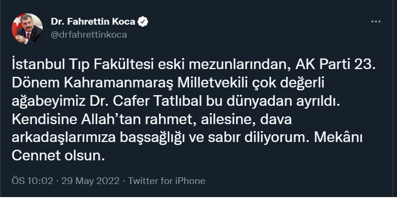 Sağlık Bakanı Fahrettin Koca Twitter hesabından, AKP 23. Dönem Kahramanmaraş Milletvekili Cafer Tatlıbal'ın hayatını kaybettiğini duyurdu.