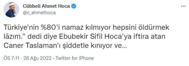 "'Türkiye'nin %80'i namaz kılmıyor hepsini öldürmek lâzım' dedi diye Ebubekir Sifil Hoca'ya iftira atan Caner Taslaman'ı şiddetle kınıyor ve Türkiye'de başta Diyânet olmak üzere hiçbir kurumda din adamı kalmamış gibi bu konuda bilgi sormak üzere Caner Taslaman'ı çıkaran CNN Türk'ü de tekdîr ediyorum. Zîrâ Caner Taslaman hiçbir İslâmî kaynağı Arapça metninden ilk kaynağından okuyup mânâ verecek bir ilme sahip değildir.