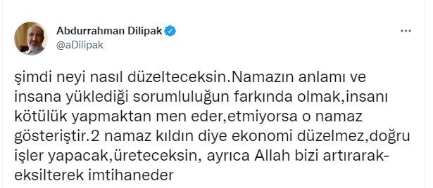 Bu sözlere sosyal medya hesabından cevap veren gazeteci Abdurrahman Dilipak “Şimdi neyi nasıl düzelteceksin. Namazın anlamı ve insana yüklediği sorumluluğun farkında olmak, insanı kötülük yapmaktan men eder, etmiyorsa o namaz gösteriştir. 2 namaz kıldın diye ekonomi düzelmez, doğru işler yapacak , üreteceksin, ayrıca Allah bizi artırarak- eksilterek imtihan eder” ifadelerini kullandı.