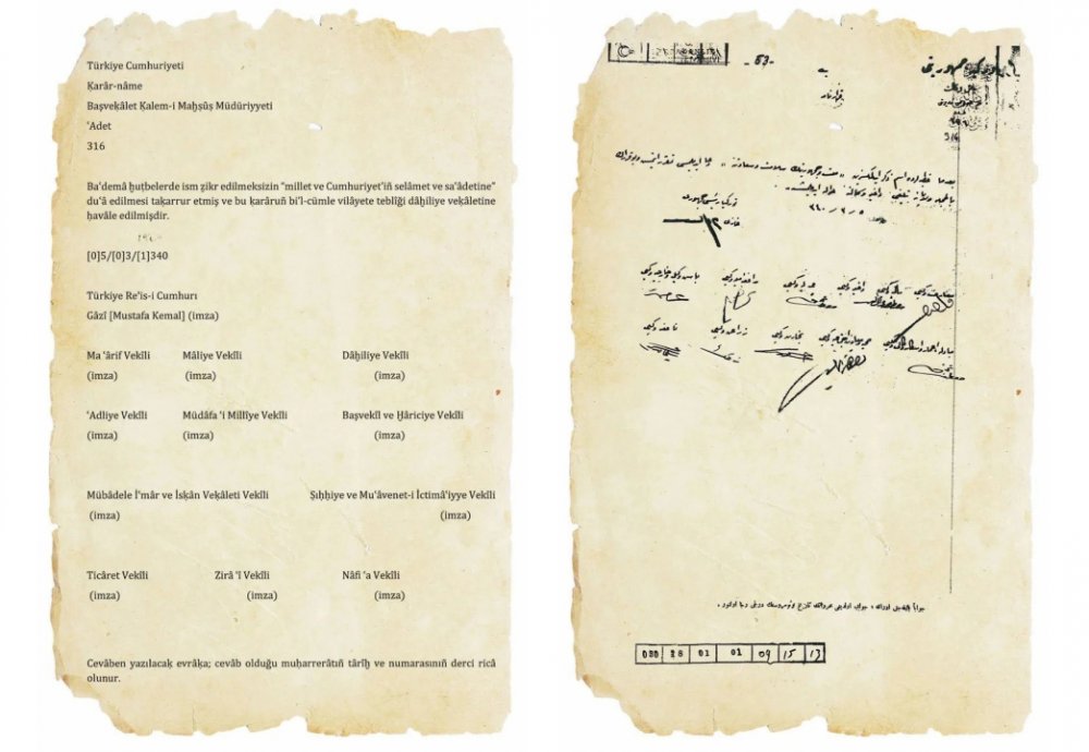 Erbaş, videolarla birlikte biri Osmanlıca, diğeri Türkçeye çevrilmiş iki belge gönderdi. Atatürk ve dönemin bakanlarının imzasını taşıyan 5 Mart 1926 tarihli kararnamede şunlar yazılı:
