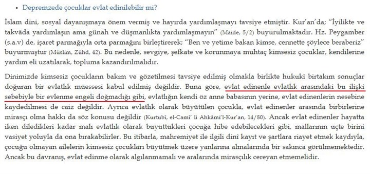 Din İşleri Yüksek Kurulu'nun sitesinde, "Depremzede çocuklar evlat edinilebilir mi?" sorusuna verilen yanıtta şu ifadeler kullanıldı: