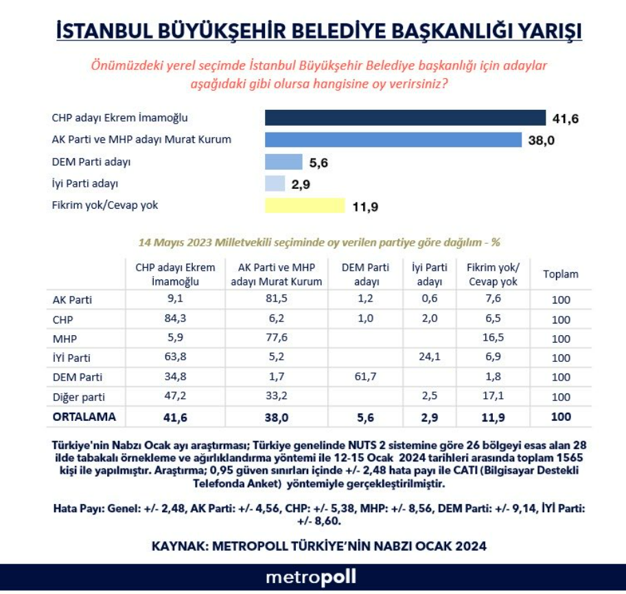 12-15 Ocak tarihleri arasında 1565 kişi ile yapılan seçim anketinde yurttaşlara "Önümüzdeki yerel seçimde İstanbul Büyükşehir Belediye başkanlığı için adaylar aşağıdaki gibi olursa hangisine oy verirsiniz?" sorusu yöneltildi.