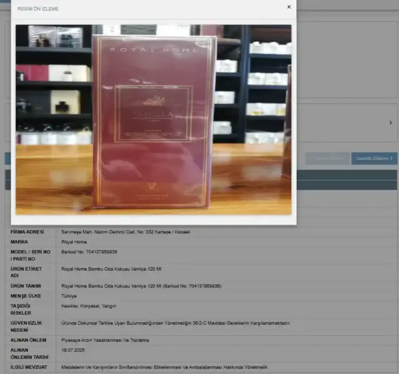 Gündeme en çok yansıyan ürün ise Royal Home markasına ait oda kokusu oldu. Ticaret Bakanlığı’nın yaptığı incelemelerde ürünün, kullanıcılar için “kesikler, kimyasal ve yangın riski” taşıdığı tespit edildi.