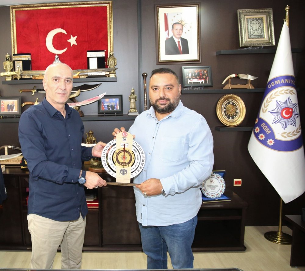 Osmaniye İl Emniyet Müdürü Ahmet Okumuş ise Gazeteci Ferhat Aydoğan’ın ziyareti anısına özel işlemeli el yapımı ahşap saat hediye etti.
