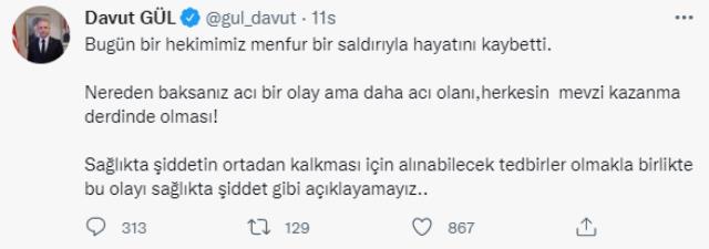 Gül sosyal medya hesabından yaptığı paylaşımda "Bugün bir hekimimiz menfur bir saldırıyla hayatını kaybetti. Nereden baksanız acı bir olay ama daha acı olanı, herkesin mevzi kazanma derdinde olması! Sağlıkta şiddetin ortadan kalkması için alınabilecek tedbirler olmakla birlikte bu olayı sağlıkta şiddet gibi açıklayamayız" dedi.