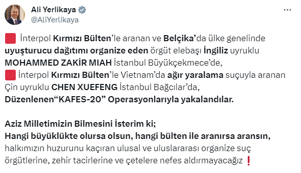 Yerlikaya'nın paylaşımında şu ifadeler yer aldı: "Aziz Milletimizin Bilmesini İsterim ki; Hangi büyüklükte olursa olsun, hangi bülten ile aranırsa aransın, halkımızın huzurunu kaçıran ulusal ve uluslararası organize suç örgütlerine, zehir tacirlerine ve çetelere nefes aldırmayacağız.