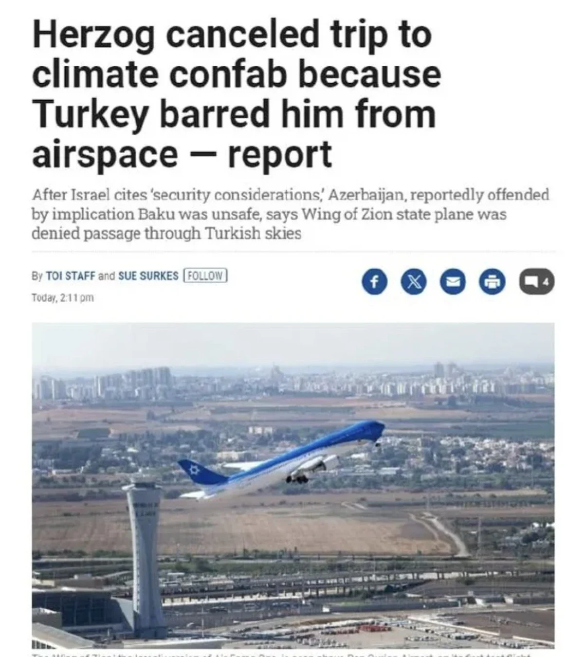 İsrail, Cumartesi günü yaptığı resmi açıklamada, Cumhurbaşkanı Isaac Herzog'un Azerbaycan'a yapmayı planladığı COP29 ziyareti'nin "güvenlik gerekçeleriyle" iptal edildiğini duyurdu. Ancak Yedioth Ahronot gazetesinin haberine göre, Azerbaycan Dışişleri Bakanlığı'na yakın kaynaklar, iptalin gerçek nedeninin Türkiye'nin, İsrail Cumhurbaşkanlığı'na ait 'Wing of Zion' adlı uçağın hava sahasından geçişine izin vermemesi olduğunu aktardı.
