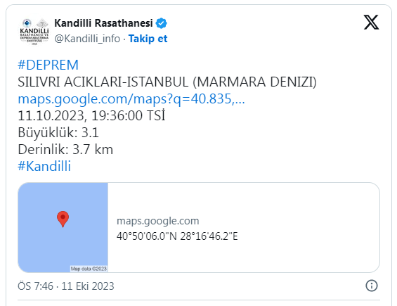 İstanbul'da Marmara Denizi Silivri açıklarında saat 19.36'da 3, 1 büyüklüğünde deprem meydana geldi. Deprem yerin 3.7 kilometre derinliğinde gerçekleşti.