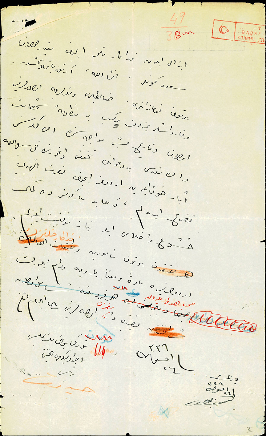 Cidal-i millinin bidayetinden beri zafer-i katʻinin istihsali içün maddi, manevî bütün kuvvetlerini ibzal eyleyen fedakar milletimiz içün mukadder olan mesud günler, inşaallah artık yaklaşmışdır. Bütün kumandanları, zabitleri ve neferleriyle evladlarımız ve kardaşlarımızdan mürekkeb bir manzume-i şehamet olan ve tarih-i beşer muvacehesinde en lekesiz ve en mukaddes bir davânın tahakkuku uğrunda fî sebîlillâh îsâr-ı hûn eyleyen ordumuz içün nusret-i İlâhiyeyi tazarruʻ edelim; ve maʻâbid mübârekemizde kemâl-i huşûʻ ve ihlâs ile niyâz-ı muvaffakiyet eyleyelim. Bütün memûrîn ve fedâkâr halkımızın ordularımıza maddeten ve manen yardıma devam eyleyerek mücâhede-i milliyeden nasîbedâr-ı mefharet olmalarını recâ eylerim efendim."