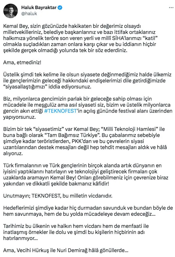 Kılıçdaroğlu paylaşımında "Bu kadar siyasallaşmayın Sevgili Haluk Bey. Siz ailece bizim için çok değerlisiniz. Bir partinin seçim propagandası olmak size yakışmaz. İstikbalde başarılı bütün Türk girişimcilerimize yer var. Uzay hepinize yetecek kadar geniş" ifadelerini kullandı.Kılıçdaroğlu'nun bu açıklamasına Bayraktar'dan yanıt gecikmedi. Bayraktar, "Kemal Bey, sizin gözünüzde hakikaten bir değerimiz olsaydı milletvekilleriniz, belediye başkanlarınız ve bazı ittifak ortaklarınız halkımıza yönelik teröre son veren yerli ve millî SİHA'larımızı “katil” olmakla suçladıkları zaman onlara karşı çıkar ve bu iddianın hiçbir şekilde gerçek olmadığı yolunda tek bir söz ederdiniz. " ifadelerine yer verdi.