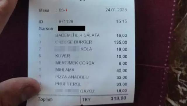 Adisyondaki fiyatların, piyasa fiyatlarının neredeyse dörtte 1 oranında olduğu görüldü. Söz konusu adisyonda, 1 bademli ılık salata, 3 cheese burger, 2 kola, 1 mercimek çorba, 1 mıhlama, 1 pizza, 3 profiterol ve 3 gazoza sadece 318 TL ödendi.