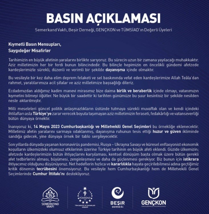 Menzil tarikatına bağlı Semerkand Vakfı, 14 Mayıs’ta yapılacak Cumhurbaşkanlığı ve Milletvekili Genel Seçimleri’nde destekleyecekleri ittifakı açıkladı.