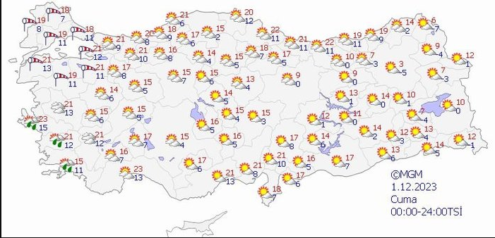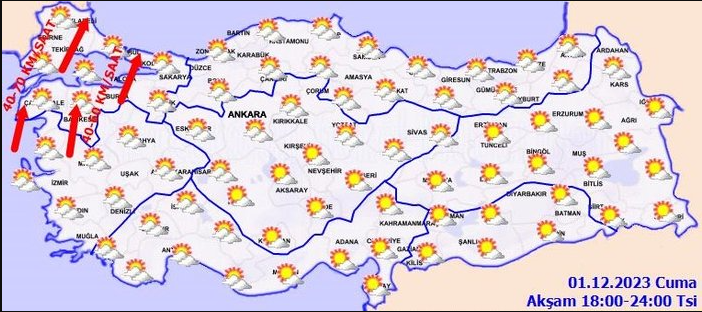 Ülkemizin kuzey, iç ve batı kesimlerinin parçalı yer yer çok bulutlu, akşam saatlerine kadar Kıyı Ege'nin aralıklı sağanak yağışlı, diğer yerlerin az buutlu ve açık geçeceği tahmin ediliyor. Sabah ve gece saatlerinde iç ve doğu kesimlerde yer yer pus ve sis bekleniyor. Hava sıcaklıkların yurt genelinde mevsim normallerinin 4 ila 6 derece üzerinde seyretmesi bekleniyor.