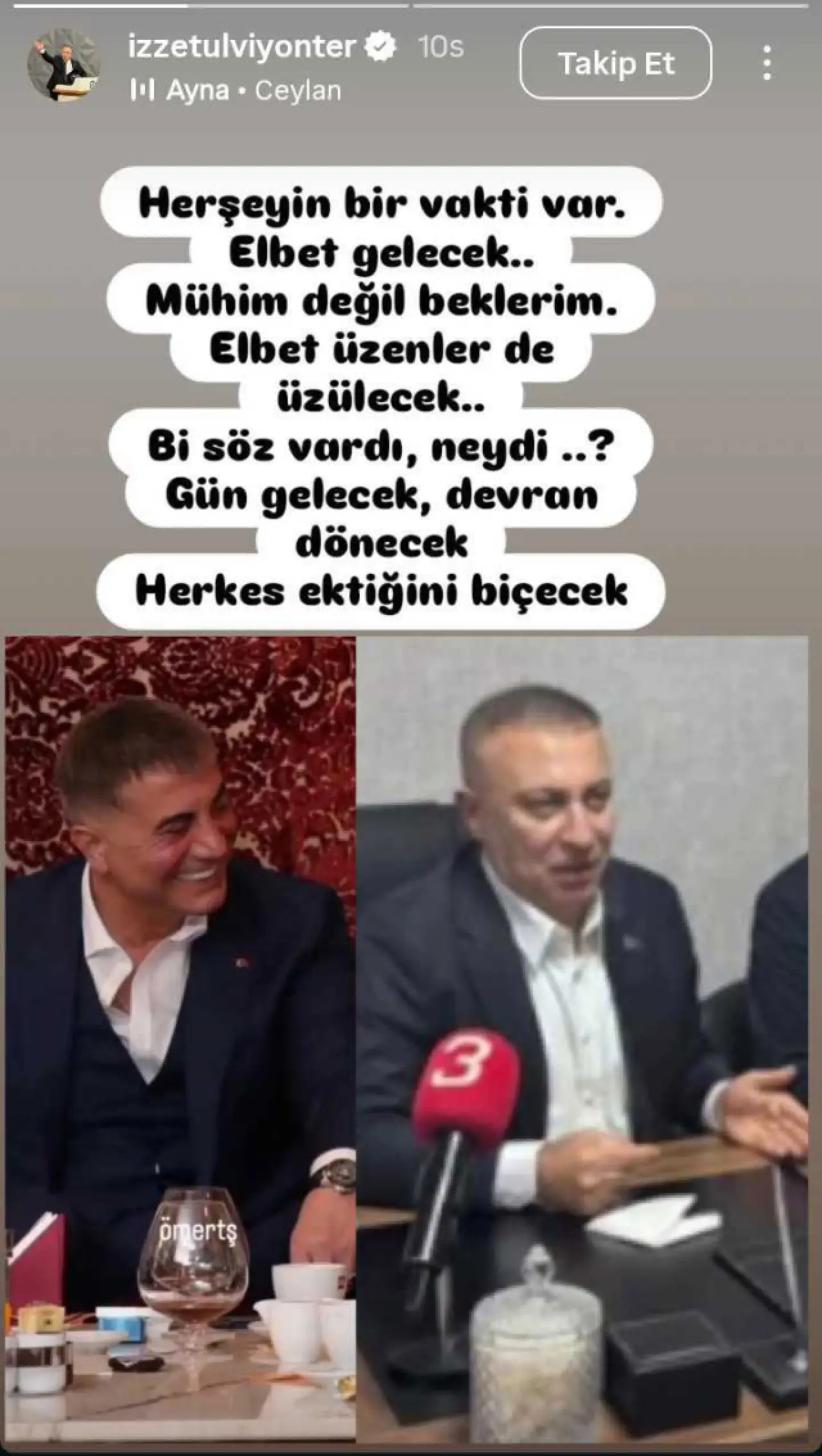 "Her şeyin bir vakti var. Elbet gelecek... Mühim değil, beklerim. Elbet üzülenler de üzülecek... Bir söz vardı, neydi..? Gün gelecek, devran dönecek. Herkes ektiğini biçecek." ifadelerini kullanan Yönter, bu sözlerle adeta geleceğe dönük bir mesaj verdi.