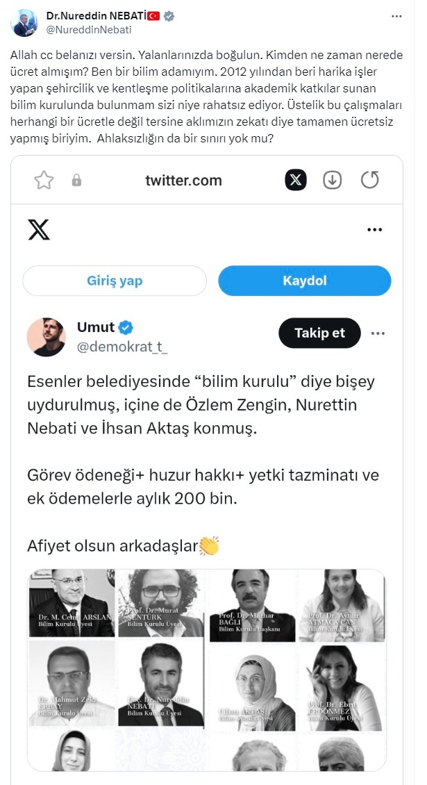 “Allah cc belanızı versin. Yalanlarınızda boğulun. Kimden ne zaman nerede ücret almışım? Ben bir bilim adamıyım. 2012 yılından beri harika işler yapan şehircilik ve kentleşme politikalarına akademik katkılar sunan bilim kurulunda bulunmam sizi niye rahatsız ediyor. Üstelik bu çalışmaları herhangi bir ücretle değil tersine aklımızın zekatı diye tamamen ücretsiz yapmış biriyim. Ahlaksızlığın da bir sınırı yok mu?”