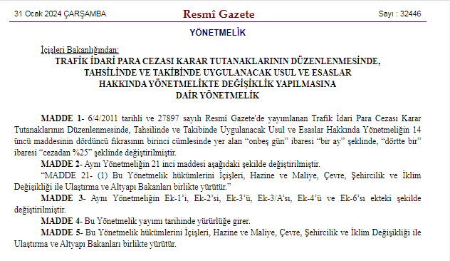 İçişleri Bakanlığı tarafından Resmi Gazete’de yayımlanan yönetmelikle, trafik cezalarında indirimli ödeme süresi 15 günden 1 aya çıkarıldı. Trafik İdari Para Cezası Karar Tutanaklarının Düzenlenmesinde, Tahsilinde Ve Takibinde Uygulanacak Usul Ve Esaslar Hakkında Yönetmelikte değişikliğe gidildi.