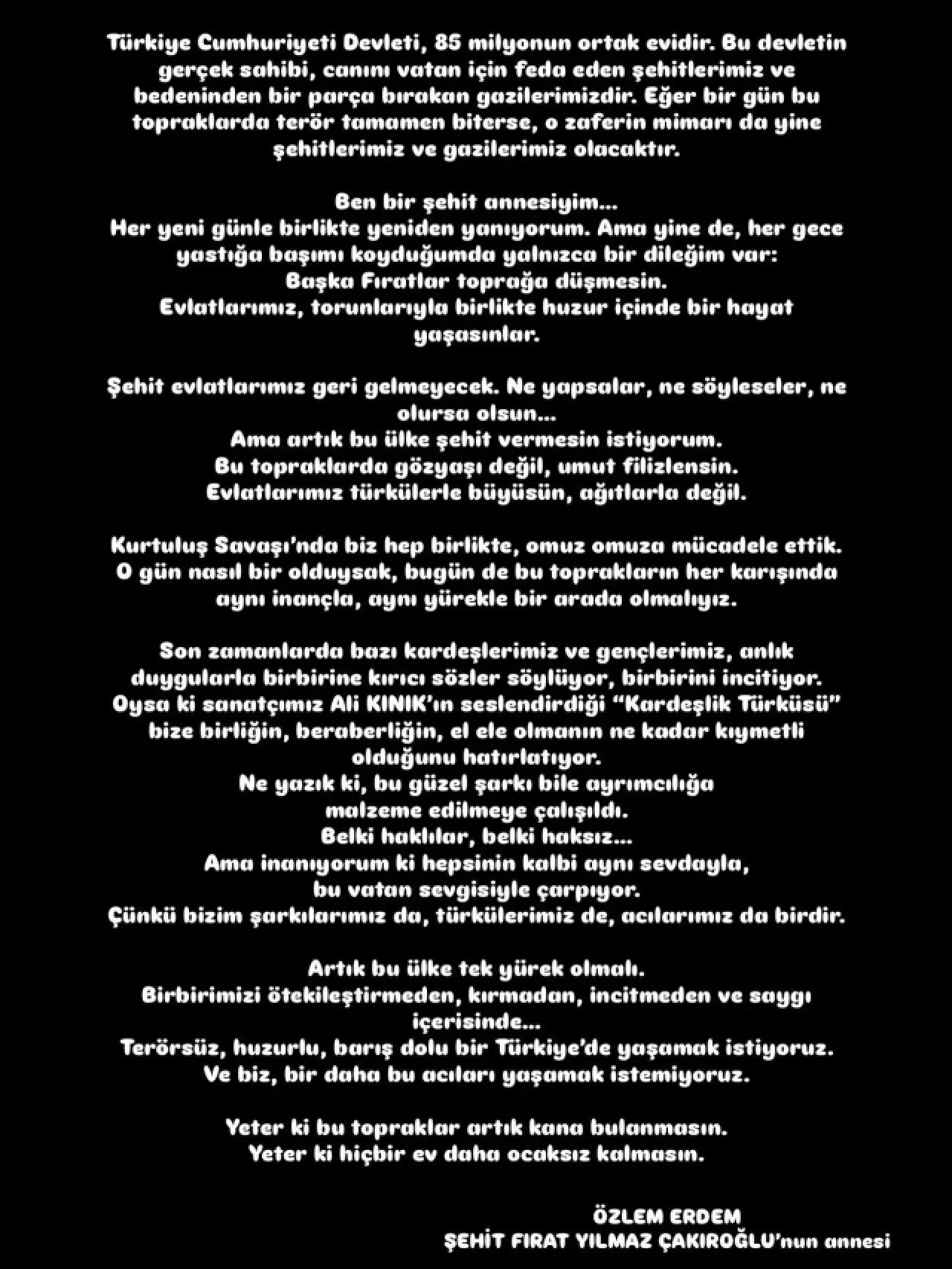 Ege Üniversitesi’nde 2015 yılında bölücü terör örgütü sempatizanlarının saldırısında şehit düşen Fırat Yılmaz Çakıroğlu’nun annesi Özlem Çakıroğlu, yayımladığı duygu yüklü mesajla Türkiye’nin vicdanına seslendi. Yürekleri sızlatan paylaşımında, bir anne yüreğinden yükselen feryatla, milletin birlik ve beraberliğine çağrıda bulundu. Çakıroğlu’nun sözleri, özellikle toplumsal ayrışmanın arttığı bu dönemde geniş yankı uyandırdı.